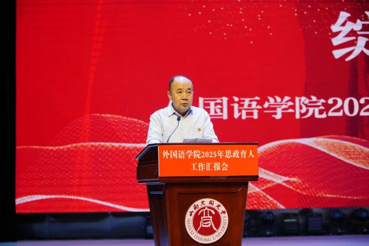 2025年12月30日,外国语学院2025年思政育人工作汇报会在本真楼演播厅举行。大同市大剧院管理中心主任张建英,校团委书记李凯军,校党委学生工作部副部长张冠华,校宣传部思政科副科长张洁琦,学院党委书记张俊杰等领导出席。学院全体专兼职辅导员、受表彰集体及个人代表、学生党员、预备党员和各年级学生代表参会,共话思政育人成效。