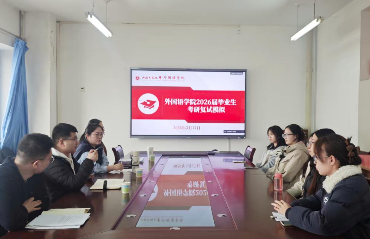 为助力学院2026届毕业生顺利通过研究生复试,3月18日,外国语学院举办考研复试指导活动,活动采用线上线下相结合的方式,邀请俄日系主任任斐、英语系教师闫小芳、商务英语系教师陈红涛、翻译专业教师张丽芙及专职辅导员李聪担任指导老师,为备考学生提供全方位复试指导。