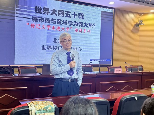 2026年3月28日下午,北京大学世界传记研究中心主任赵白生教授应邀为外国语学院师生作了题为《世界大同五十载——城市传与区域学为何大热?》的学术讲座。讲座由院长张晓世教授主持,部分人文学科学生也闻讯前来参加交流。